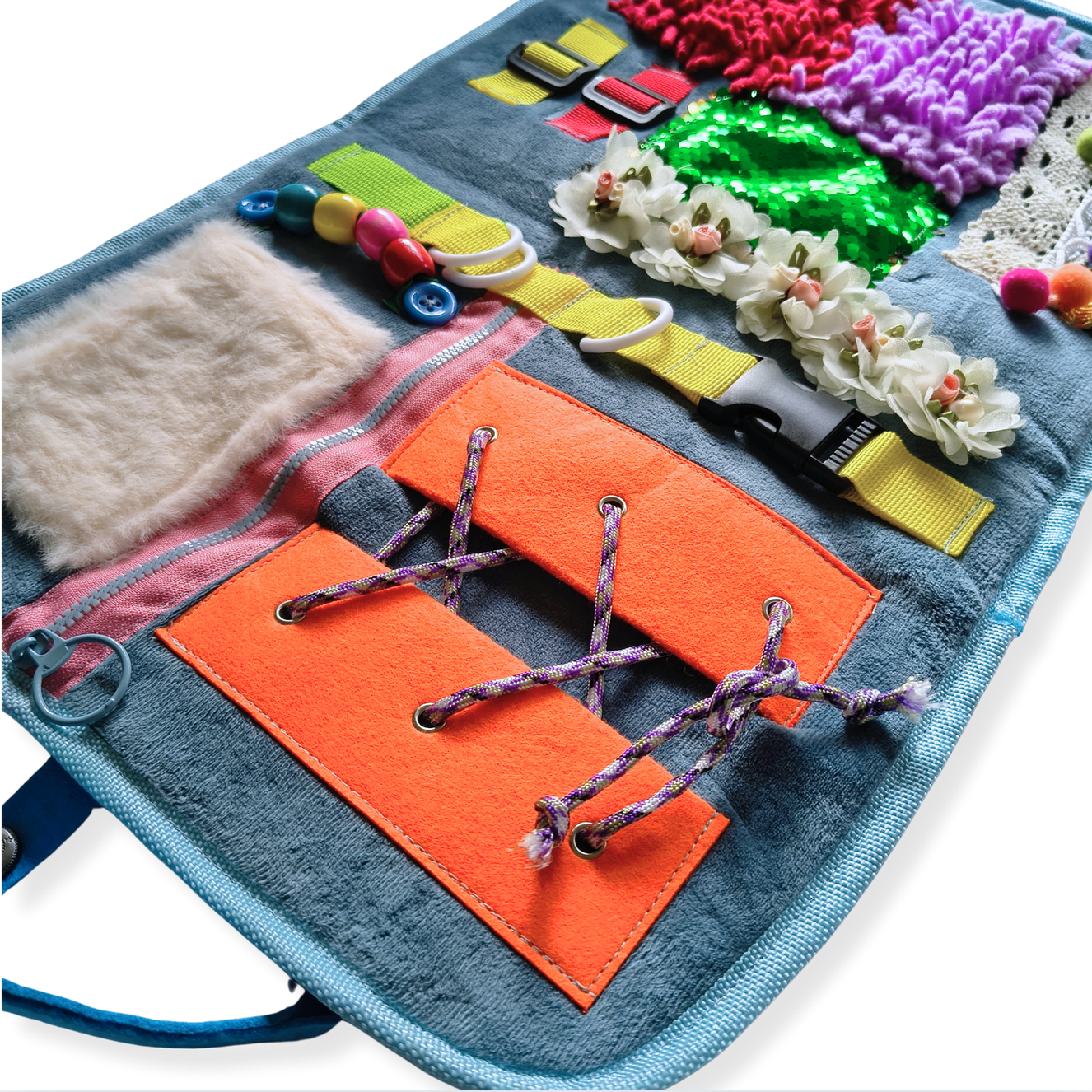 With tactile features like faux fur, buckles, beads, sequins, zippers, and floral embellishments, each section encourages gentle fine motor movement and sensory exploration. Its lightweight, carry-case design makes it easy to use on laps, in bed, or on the go—perfect for aged care, travel, or quiet time at home.
