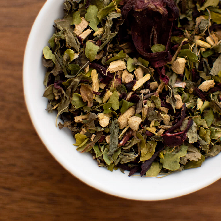 Lemongrass, hibiscus petals, lemon myrtle, peppermint, ginger, licorice root, and spearmint.